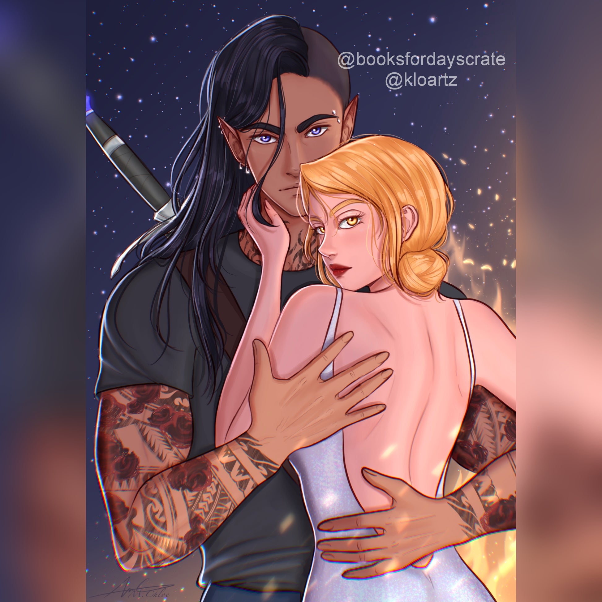 5x7 art print of Ruhn and Lidia from the book series Crescent City, by Sarah J. Maas, © 2015. Artwork by @romannaboch. Reprinted by permission of Writers House LLC acting as agent for the author.