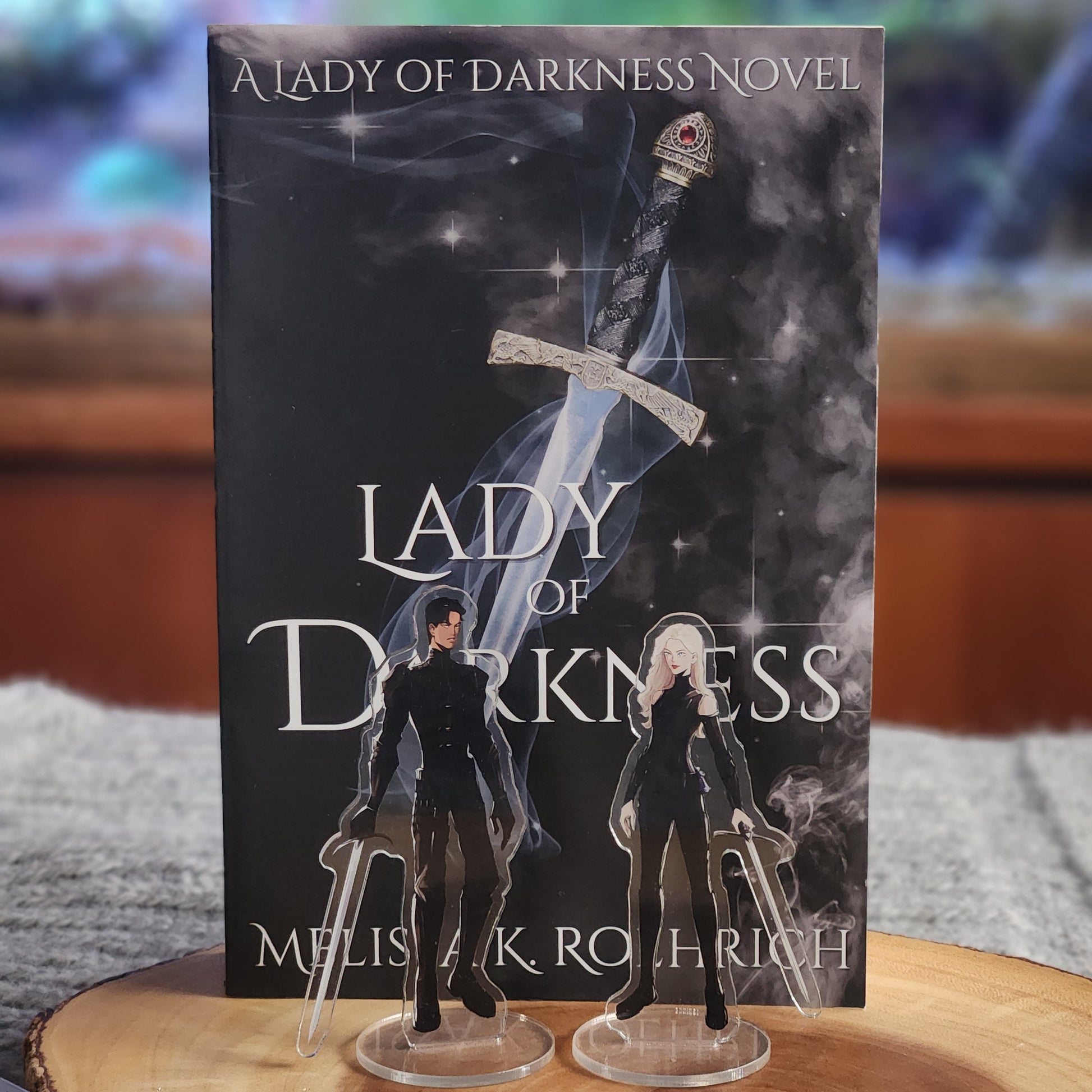 Acrylic standees of Scarlett and Sorin from Lady of Darkness Series by Melissa K. Roehrich. Officially licensed.